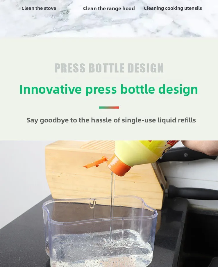 Kitchen cleaning essentials: dishwashing dispenser, auto liquid box, pot/dish brush, scouring pad, pot cleaner