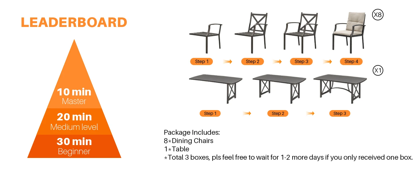 ✅ Lightweight & Easy to Relocate: Ultra-lightweight design (chair: 4.9kg, table: 29.5kg) allows one-person setup. Compact packaging (2 boxes) and split chairs simplify transport. ✅ Low Maintenance & Commercial-Ready:Wipe-clean aluminum frames and CPSIA/UL 4041:2022 certification. Ideal for homes, resorts, or hotels seeking stylish, hassle-free durability.